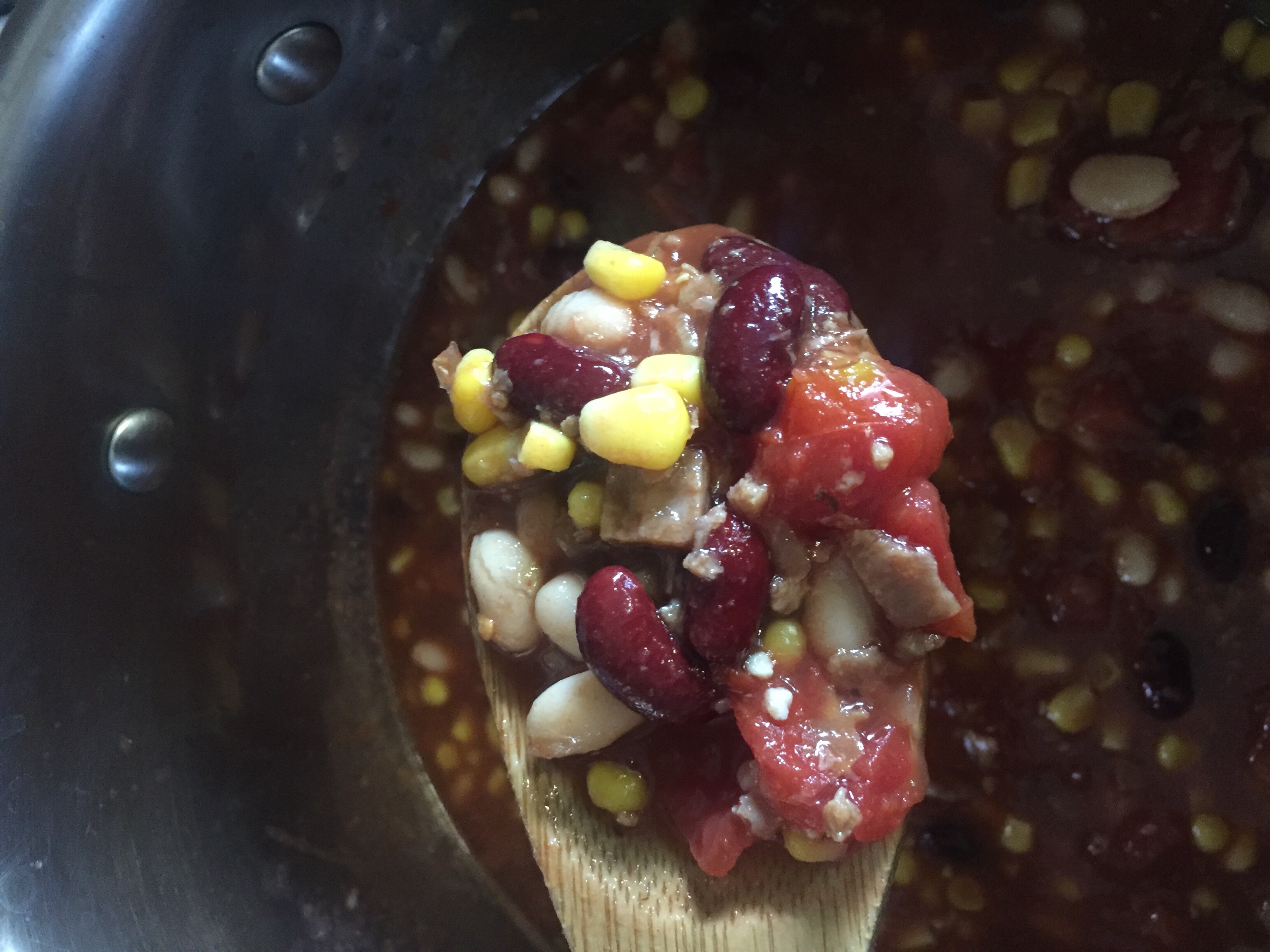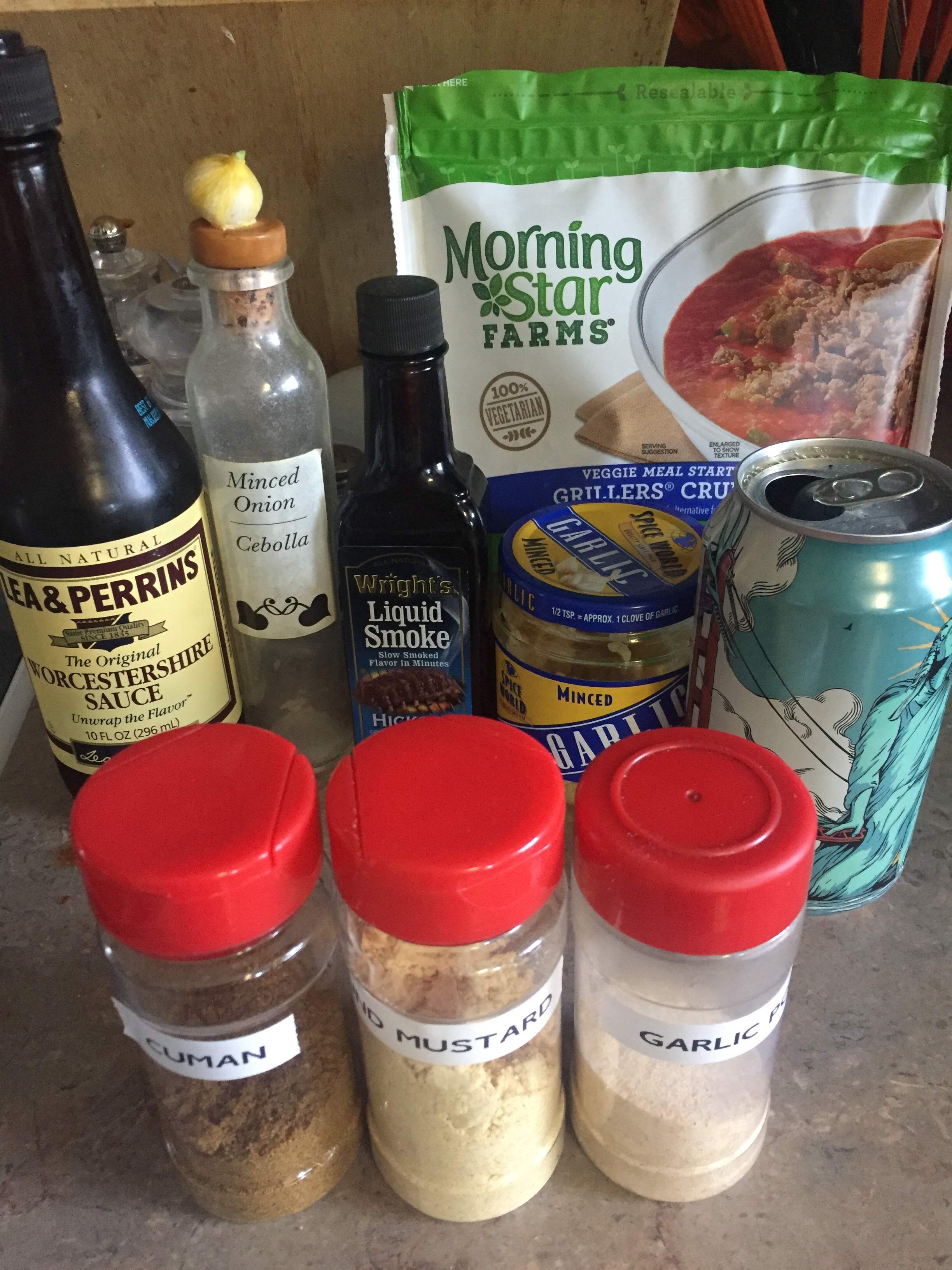 Olive oil, onion (or minced onion from Winco bulk foods), garlic sautéed for a few minutes. Add morning star crumbles, splash of Worcestershire, 1/2 can of beer (optional), cap full of liquid smoke and 1 tsp more or less of various spices, cumin, ground mustard, chili and garlic powder and let reduce. Add 2 cans of diced tomatoes, 1 can of tomato sauce, 2 cans of what ever beans are in the pantry and a can of corn. Bring to boil then simmer for an hour stirring occasionally or use the Instant Pot for 10 minutes on high pressure. DONE! “Best chili ever!” according to my Fam and it NEVER TURNS OUT THE SAME, go figure. 😉