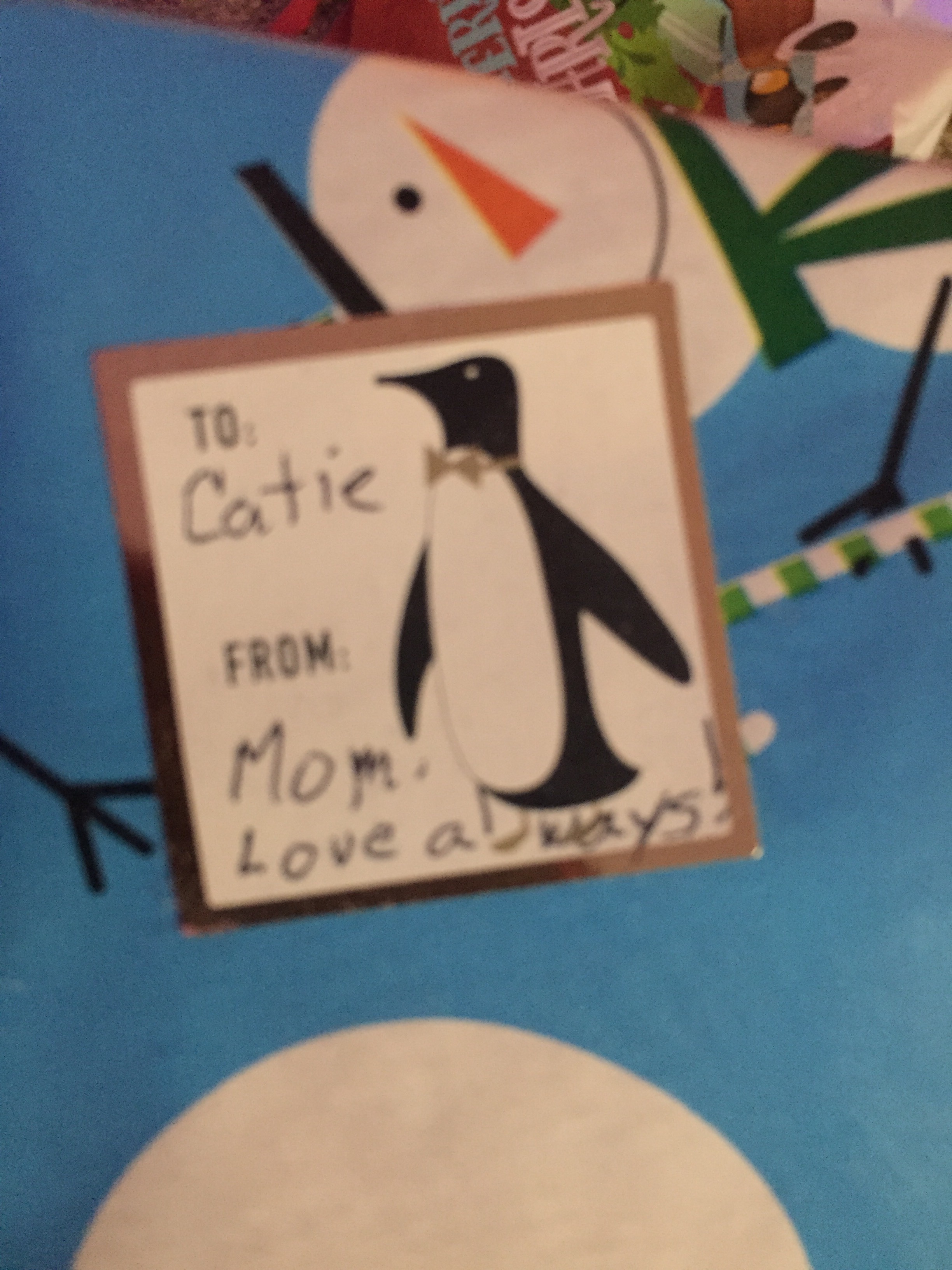 Looks like a good time was had by all. Beautiful pictures. Thought the tag โto Catie, from Mom, Love alwaysโ, was very sweet. Love always remains! Looks like youโve got some snow up there. We have had snow, too. It is snowing today, but will probably only get a few inches. The mountains have lots of snow, the skiers are happy. Now it is time to get ready for the New Year.