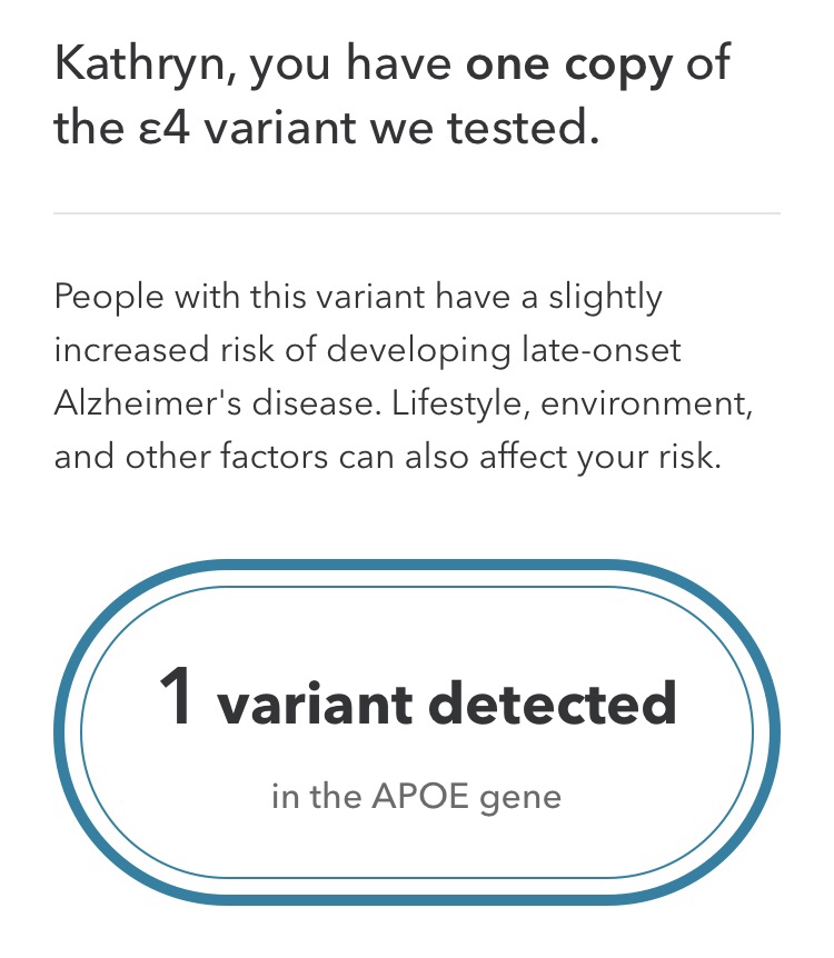 Living with mom and seeing the effects of Alzheimer’s makes me so committed to preventing this disease in myself. I HAVE tested positive for the APOE e4 variant, so my resolve is urgent.