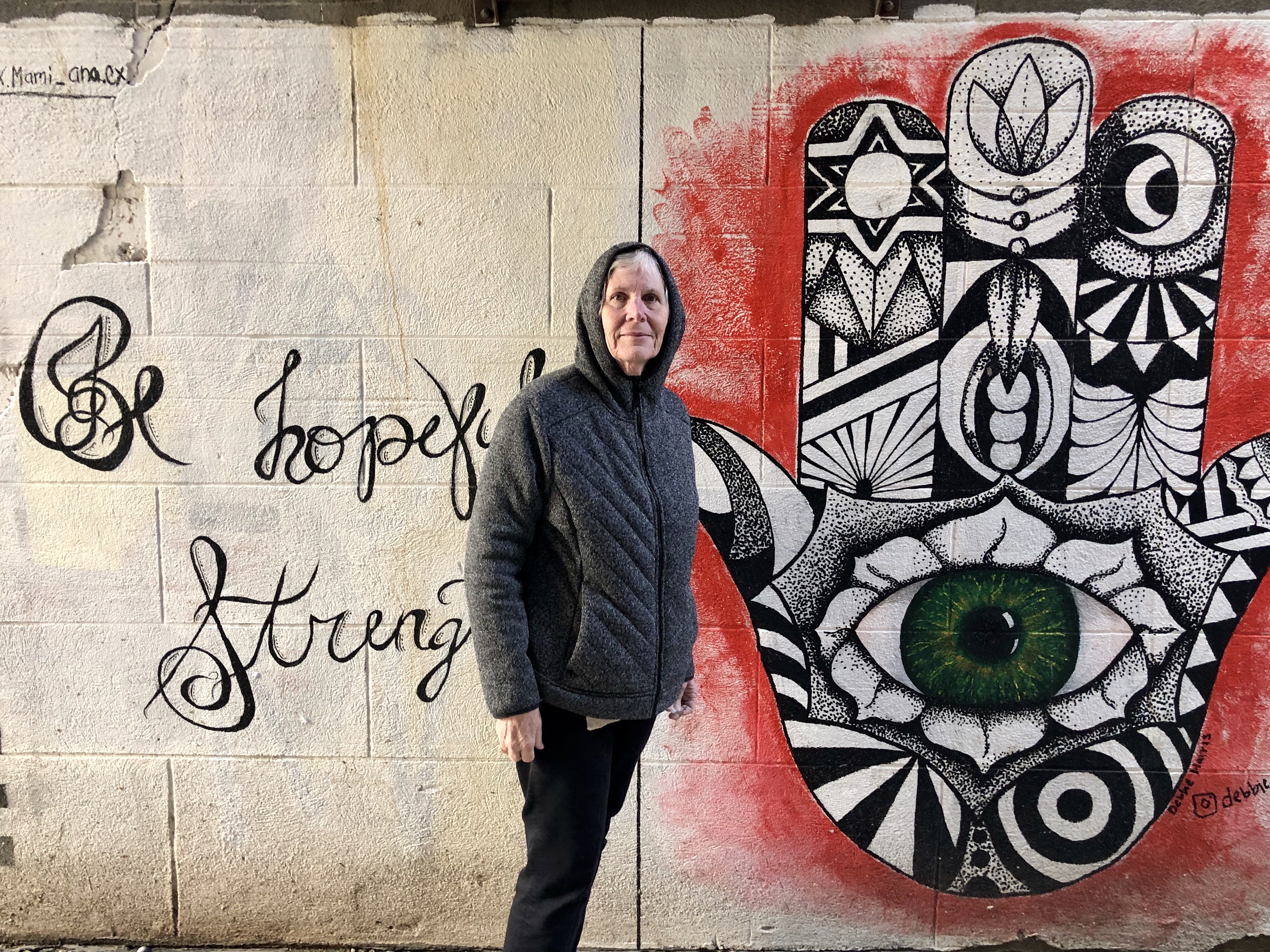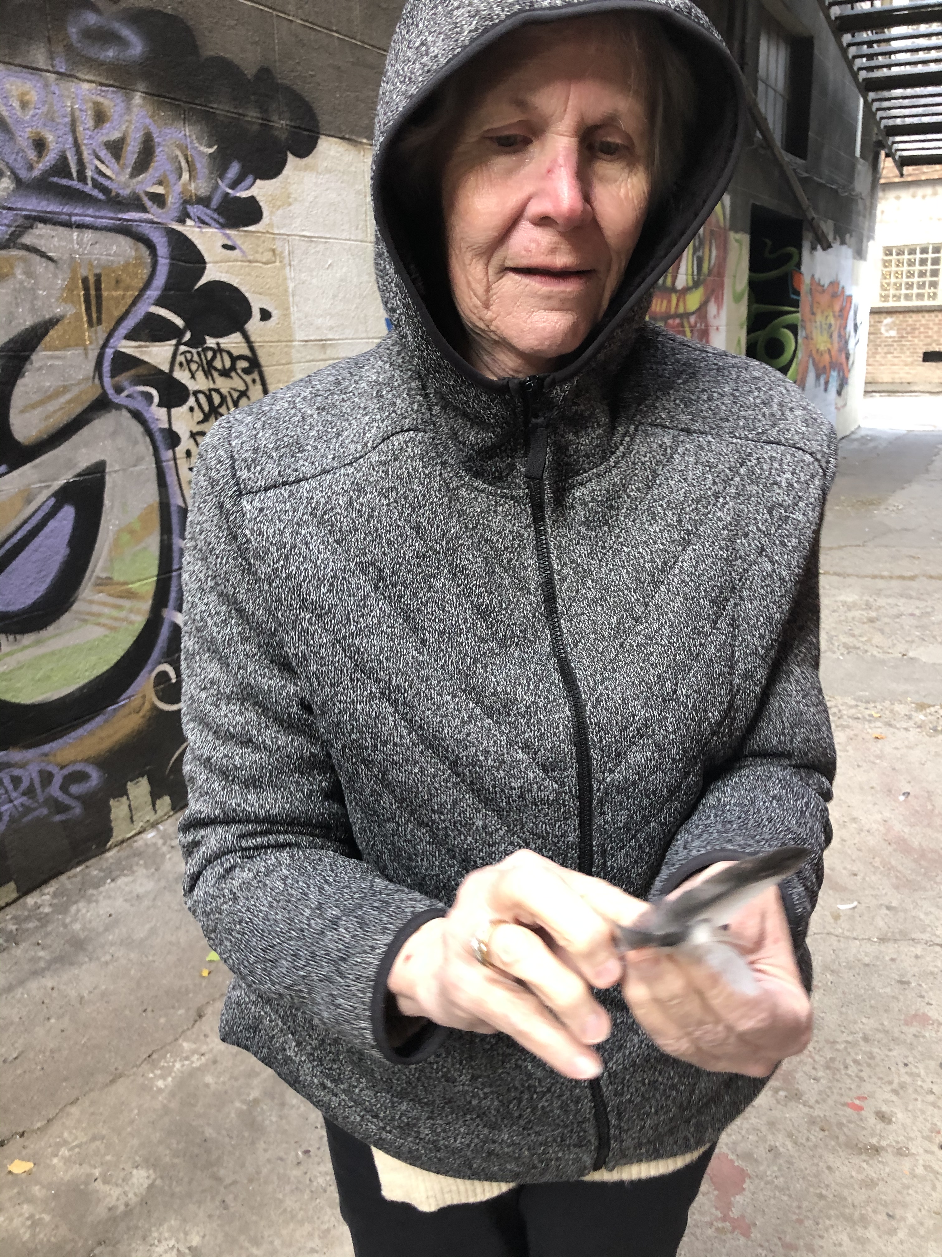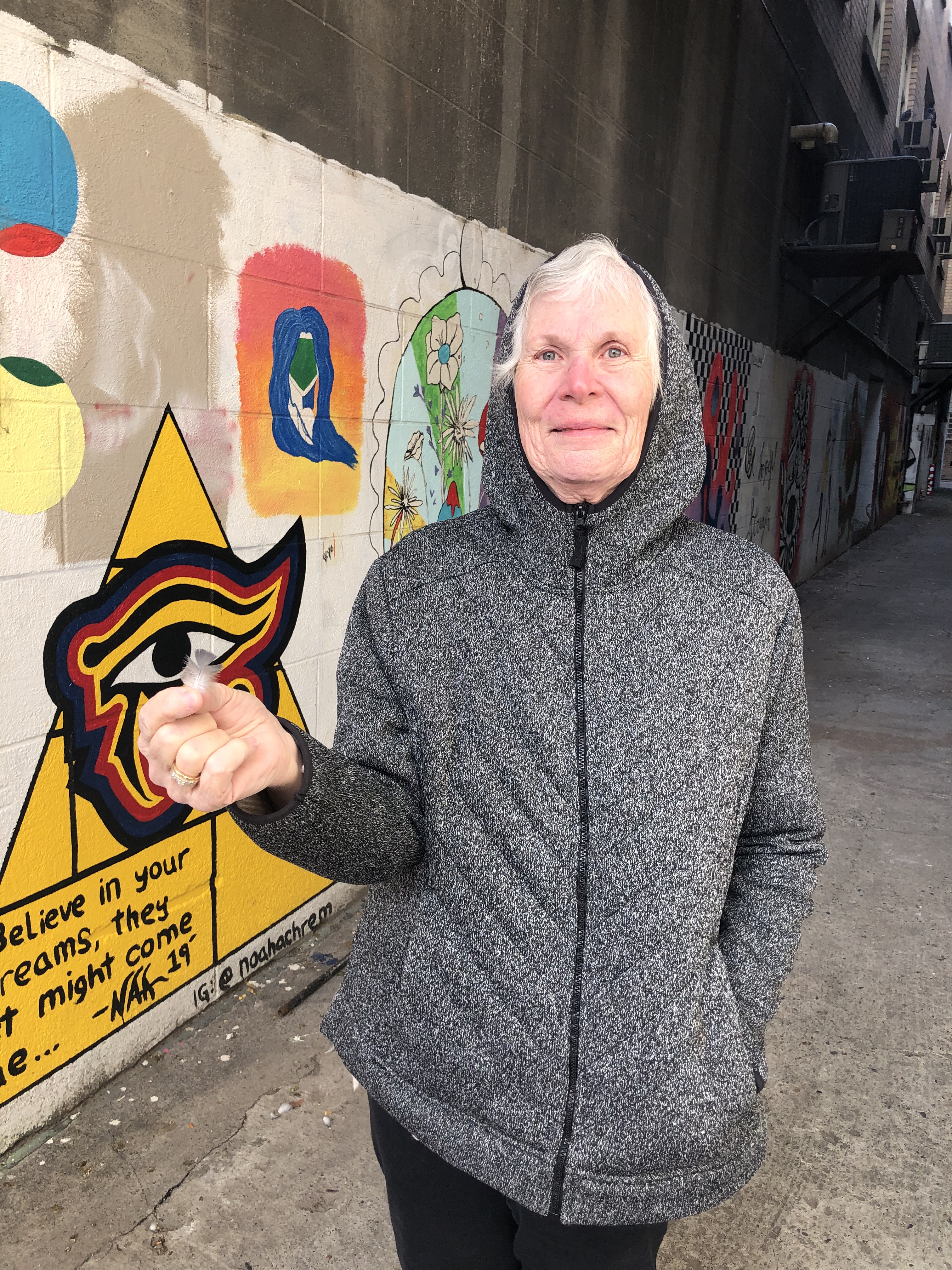 Yesterday after work the boys wanted to show us some street art downtown they had come across, so mom and I drove and the boys biked. We wandered the alleys looking at all the artwork, while mom excitedly gathered her feathers. She loves feathers. I think we should do feather bouquets instead or flowers in her room.