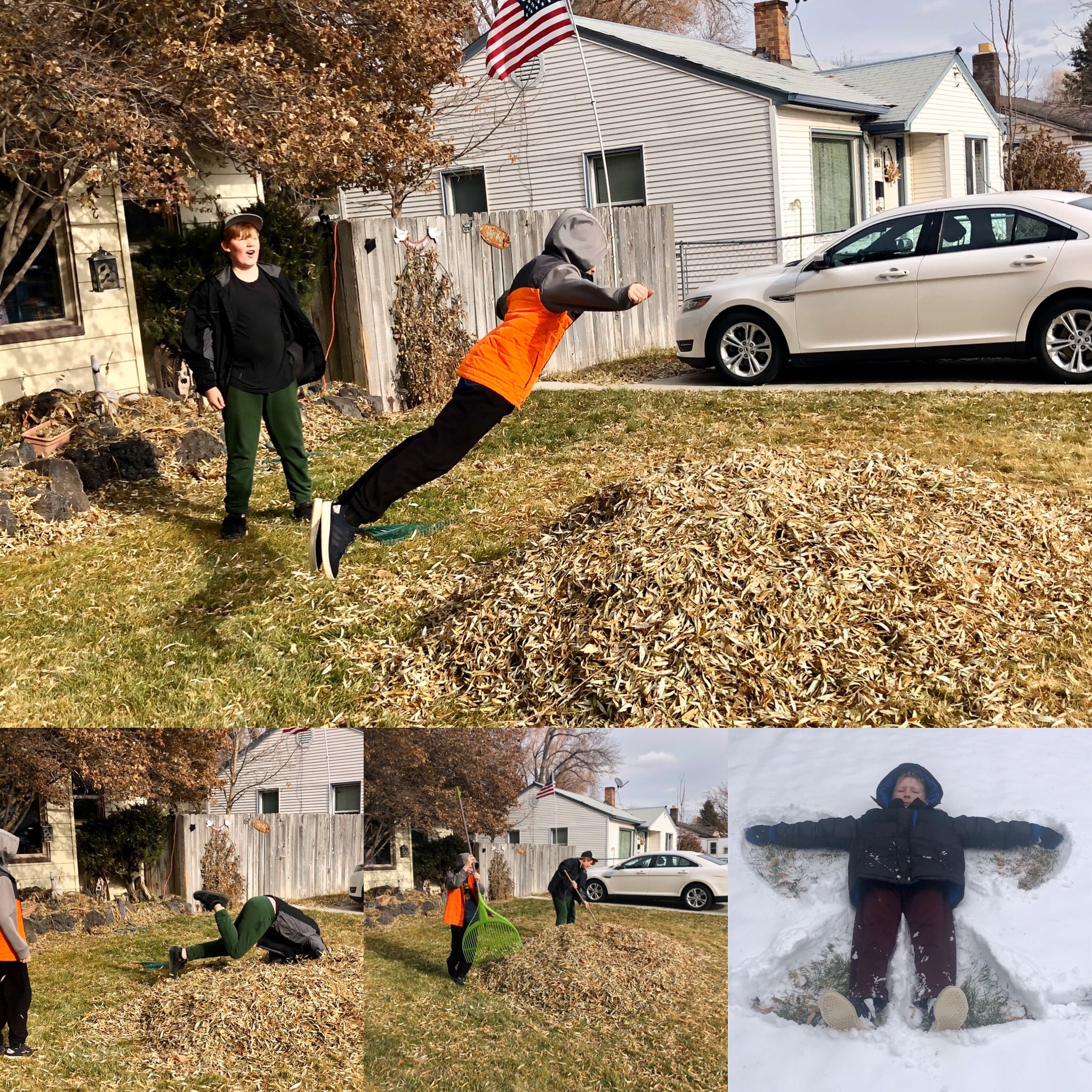 We hosted a dinner at our house instead of heading to St. George and dads due to severe weather storms. One day we are raking leaves and the next is snow angels.