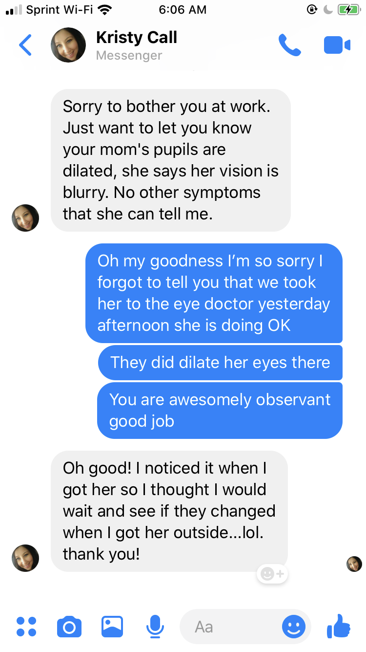 Mom had her annual eye exam with the rest of the family at ABSee vision care. They dilated her eyes and I forgot to tell Kristy, who being very observant the next day, messaged me with her concerns.