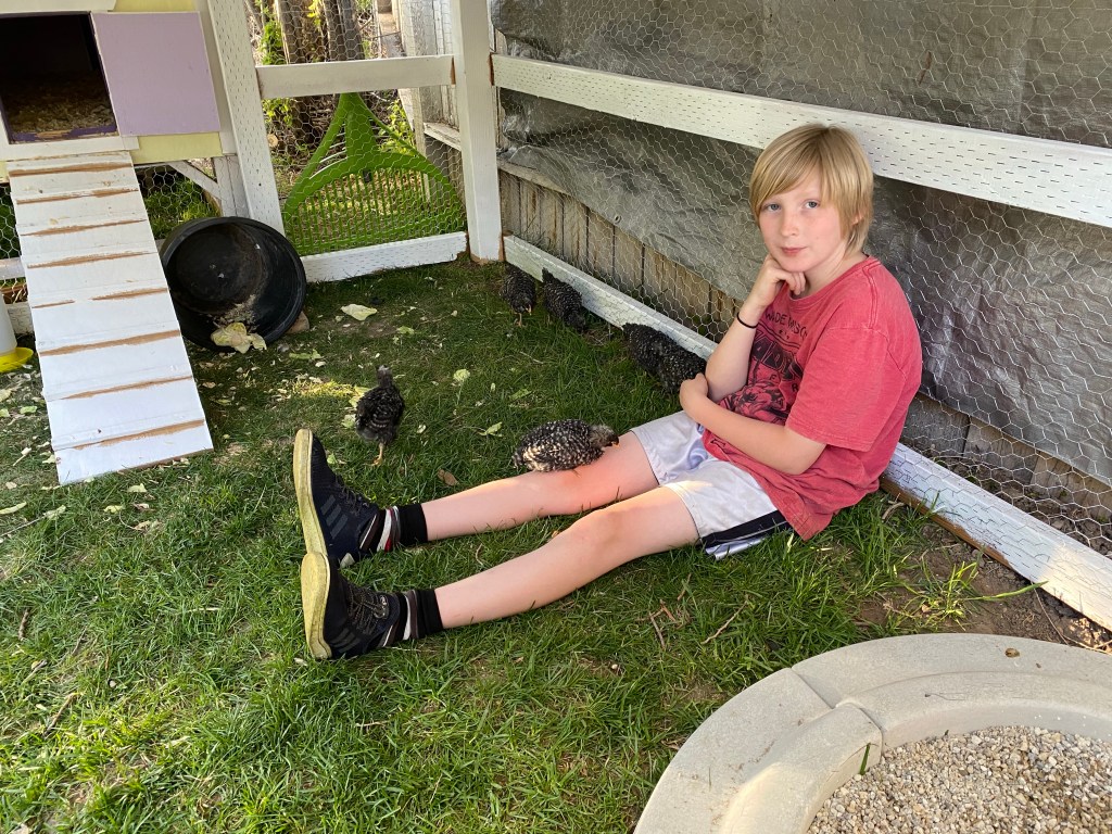She doesn’t know what to make of the chickens. But apparently her mom had some when she was a kid? I was doing some chicken training, calling “here chick, chick, chick” while shaking dried mealworms and she said, “that’s how my mom did it!”