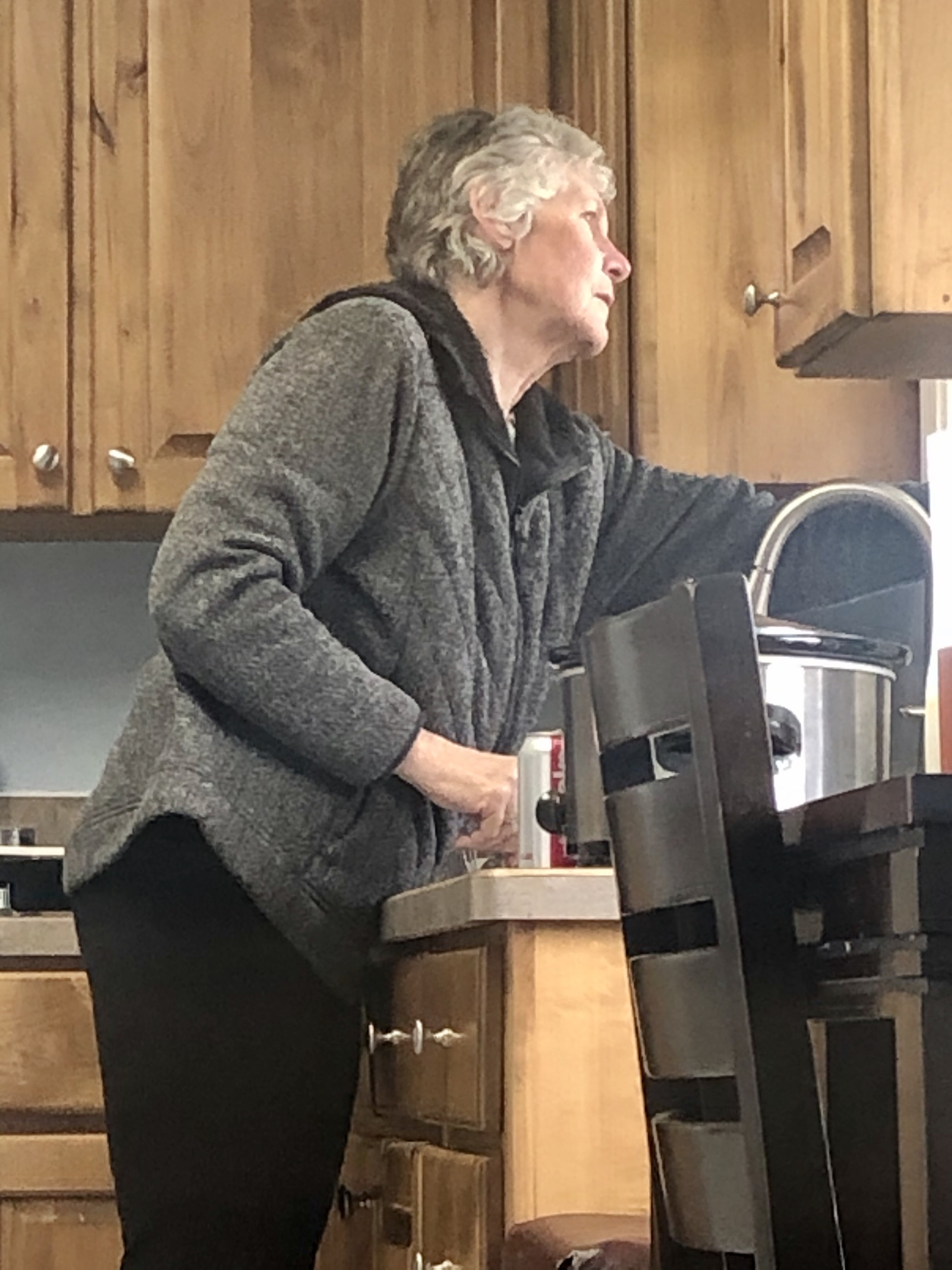 Mom likes to help in the kitchen. She stands in front of the sink scratching dishes with her fingernails. Most of the time they end back mixed in with the dirty dishes. But it keeps her busy, and I always tell her thank you for helping.