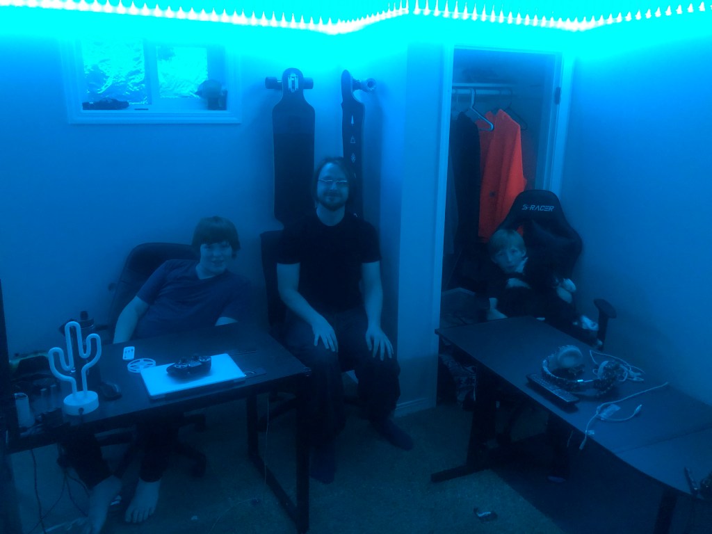 David came up for a couple nights and got to witness the fun firsthand. He helped the boys set up the office or “game room” with led lights. Joe is planning on buying components to build his own computer.