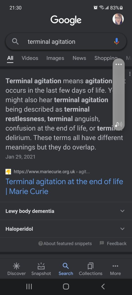 That’s a new term I learned this week. She’s in the state of constant pacing, yelling and basically agitated when she’s not asleep or highly medicated. It’s torture.