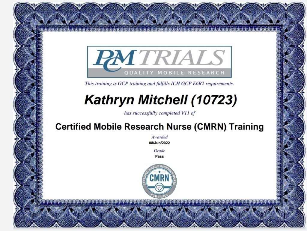 I got a second job. I’m going to be working for a company out of Colorado. I passed all the tests and got my certification to be a Certified Mobile Research Nurse.