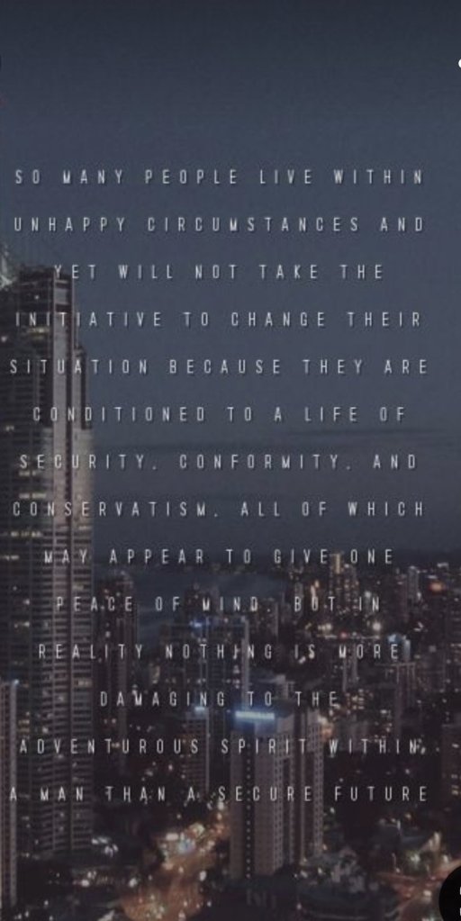 “So many people live within unhappy circumstances and yet will not take the initiative to change their situation because they are conditioned to a life of security, conformity and conservatism.